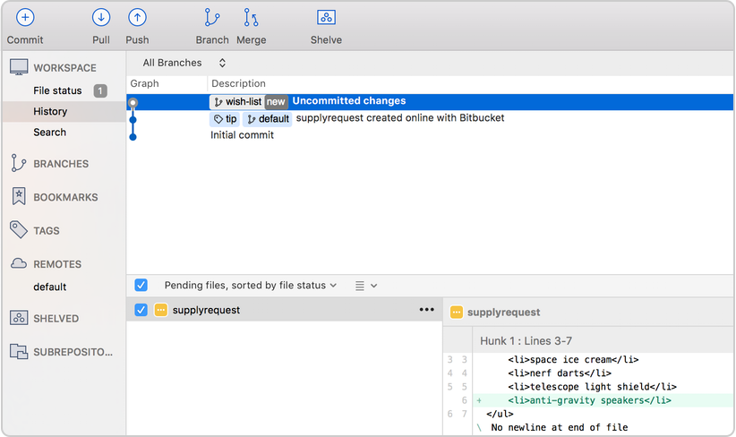 Click OK. You have updated the supplyrequest file in your main branch with your wish-list item. Sourcetree will look slightly different based on whether you have a Git or Mercurial repository.